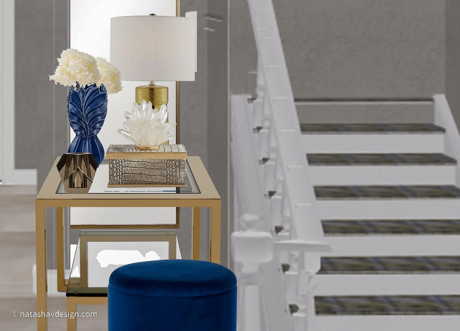 This is the area across from your blue wall, next to the stairs. Square table is approx 24” wide accessorized with gold lamp, small decorative box that has brown and cream hues. This will pick up colors from across the entryway. You don’t want one side to be all brown, it should flow throughout. Chandlier approx 22’ in diameter. Mirror is approx 24” wide x 63” height. Blue small round ottomans with gold accents