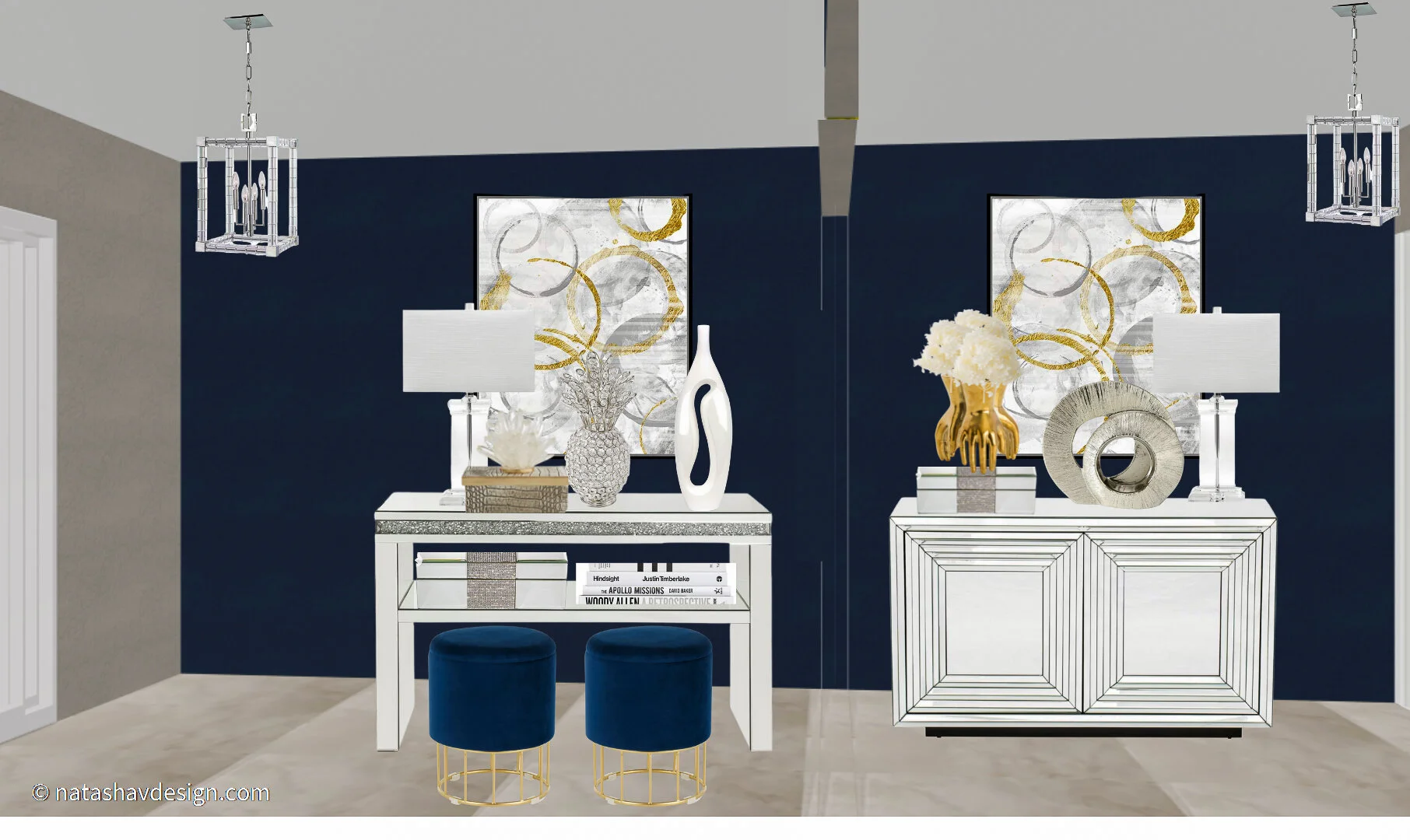 This space is highshine, luxe glam with a maximialist style. Instead of one long console I broke it up into to items, a console and a sidebar in mirrored finishes.