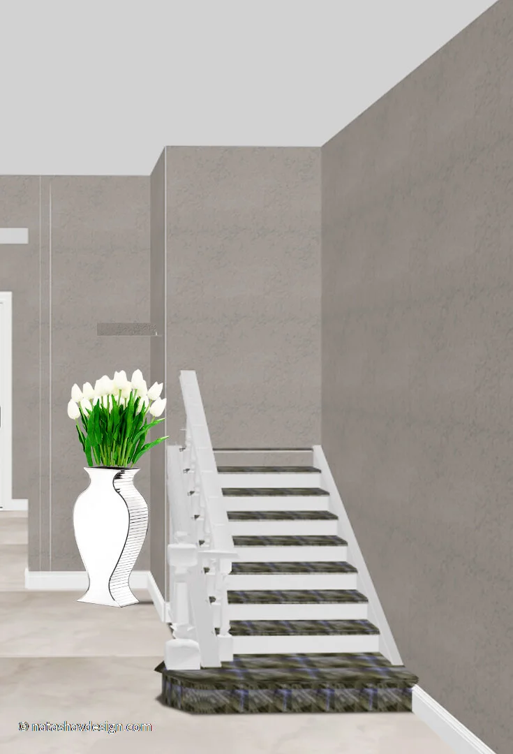 This is the area across from your blue wall, next to the stairs. This wall is very subtle it blends with concept, but it does not compete with the vibrancy of the main wall. This vase is approx 24” high and adding faux tulips or other tall flowers will give more height