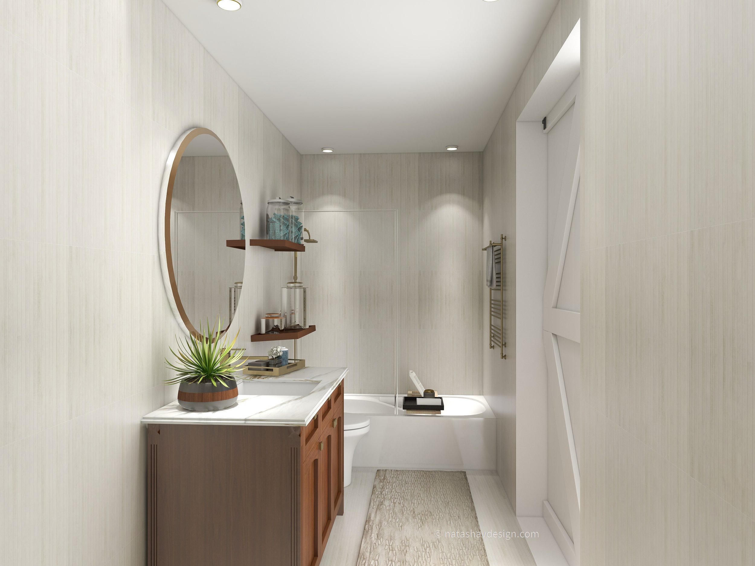 With the changed tile selection I changed the shiplap to a subway style tile. Going fully across your sink wall. The sink is a gold bowl sink as you had requested to see. I also added the oblong free standing tub with ceiling mount rainshower head. I encluded the barn doors in white with gold hardware. On the back wall is a mounted gold towel warmer rack The floating cabinet is replaced with a traditional freestanding cabinet. I did not enclude the frameless half shower doors as it may can be added later, if you find you need it. Please confrm with your contractor.