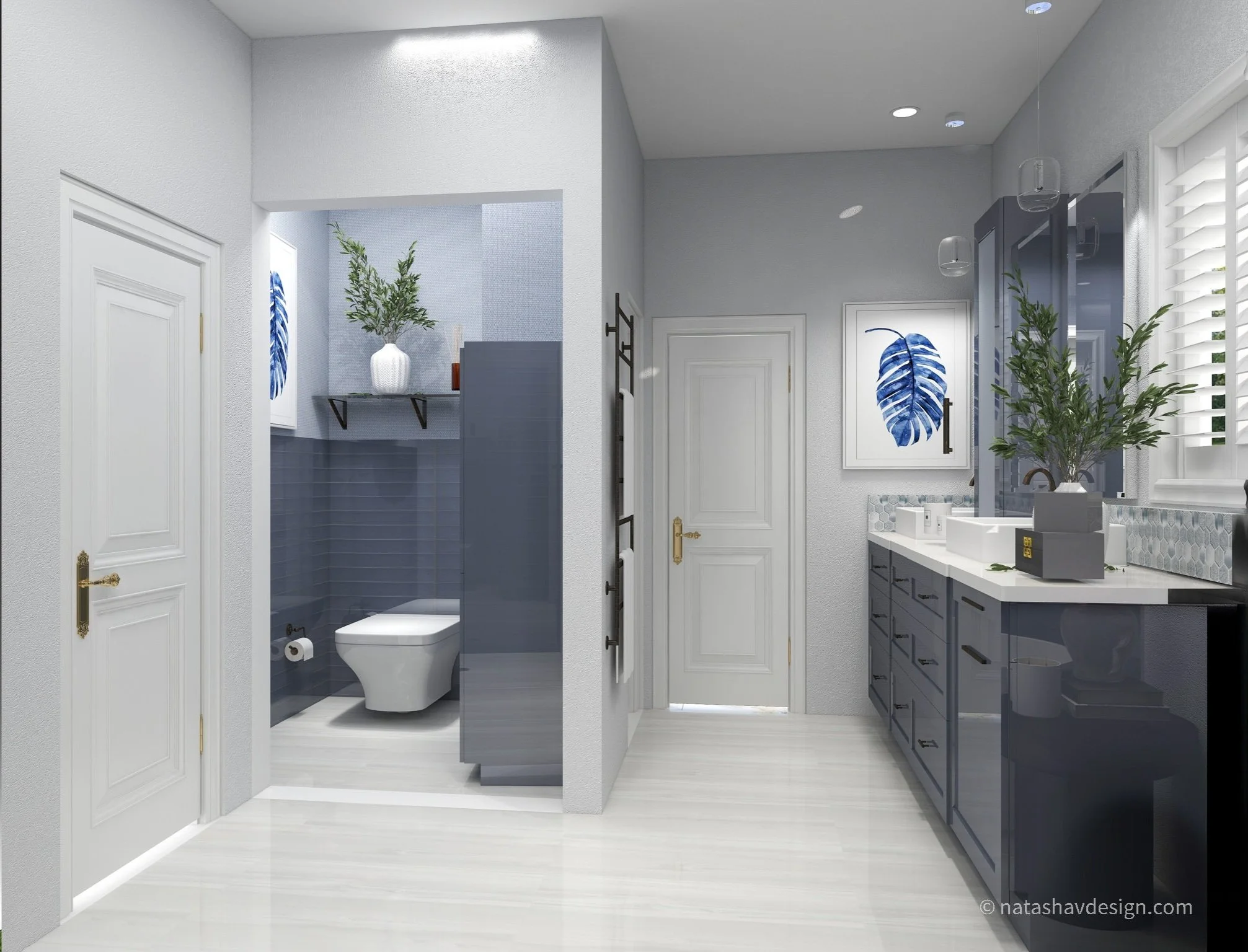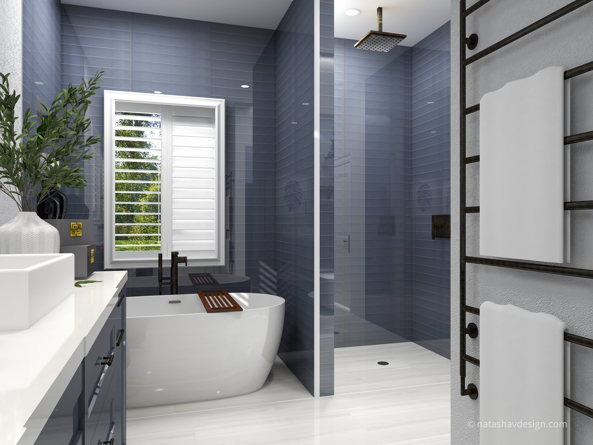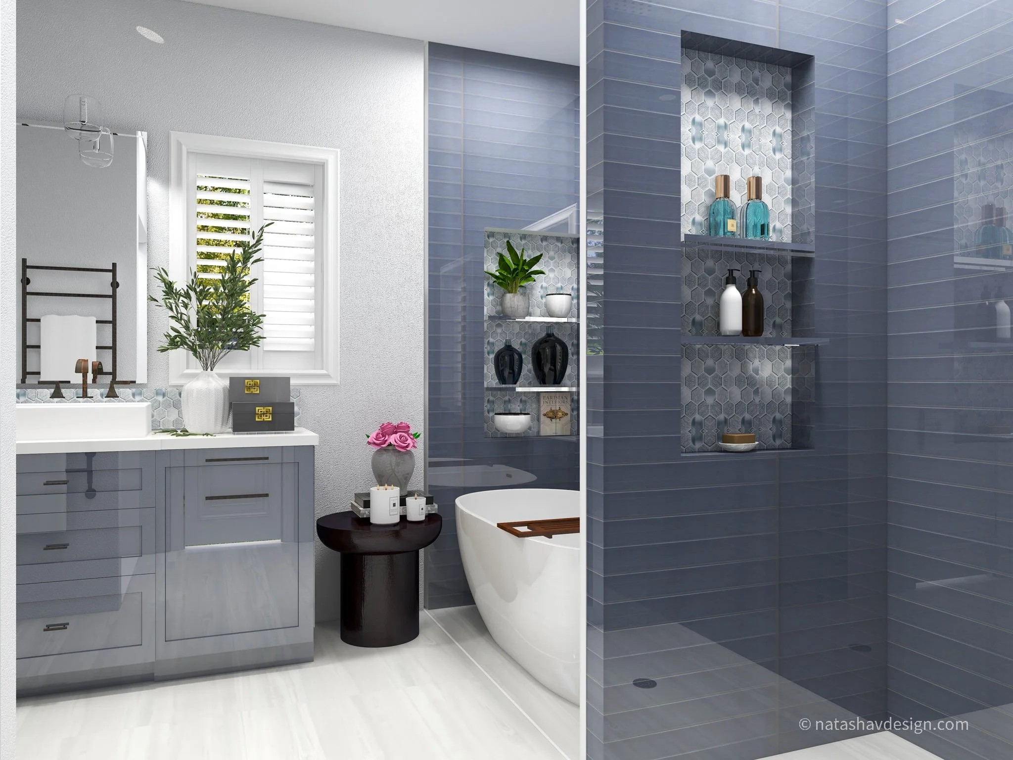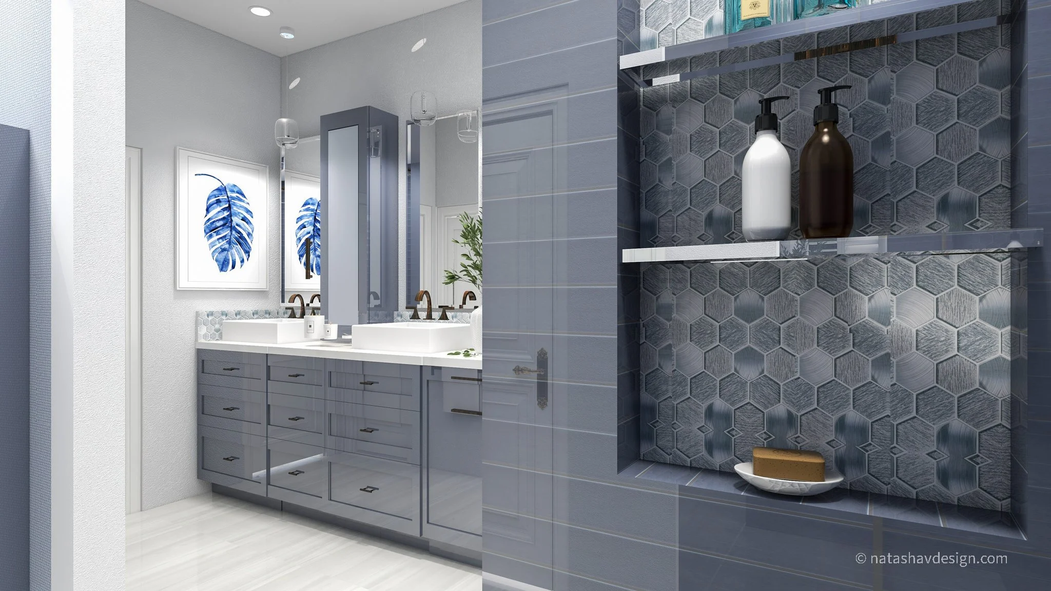 In the white vanity concept I designed a blue cabinet on top of the vanity. This brings in some of the blue tones from the tiles in the shower area.