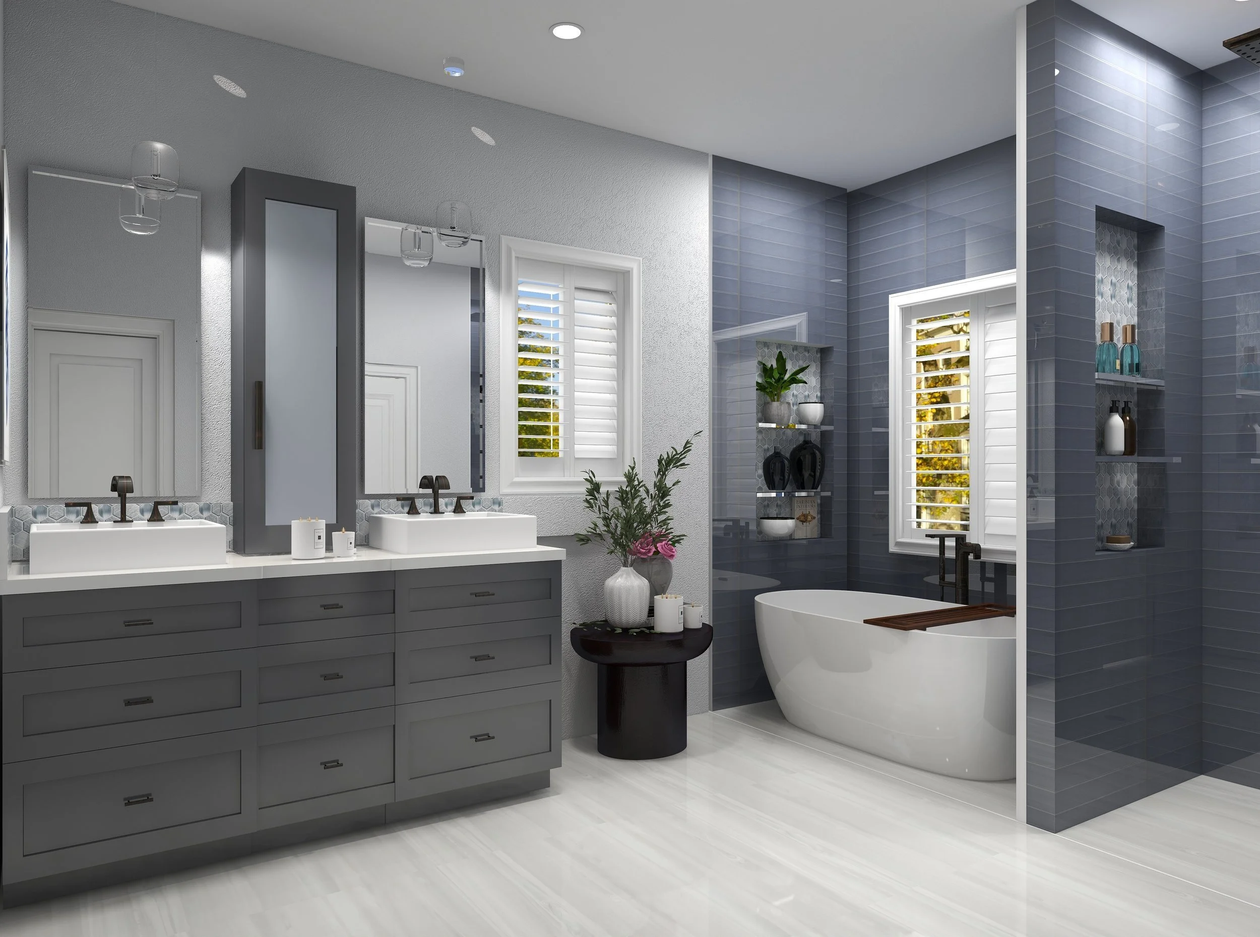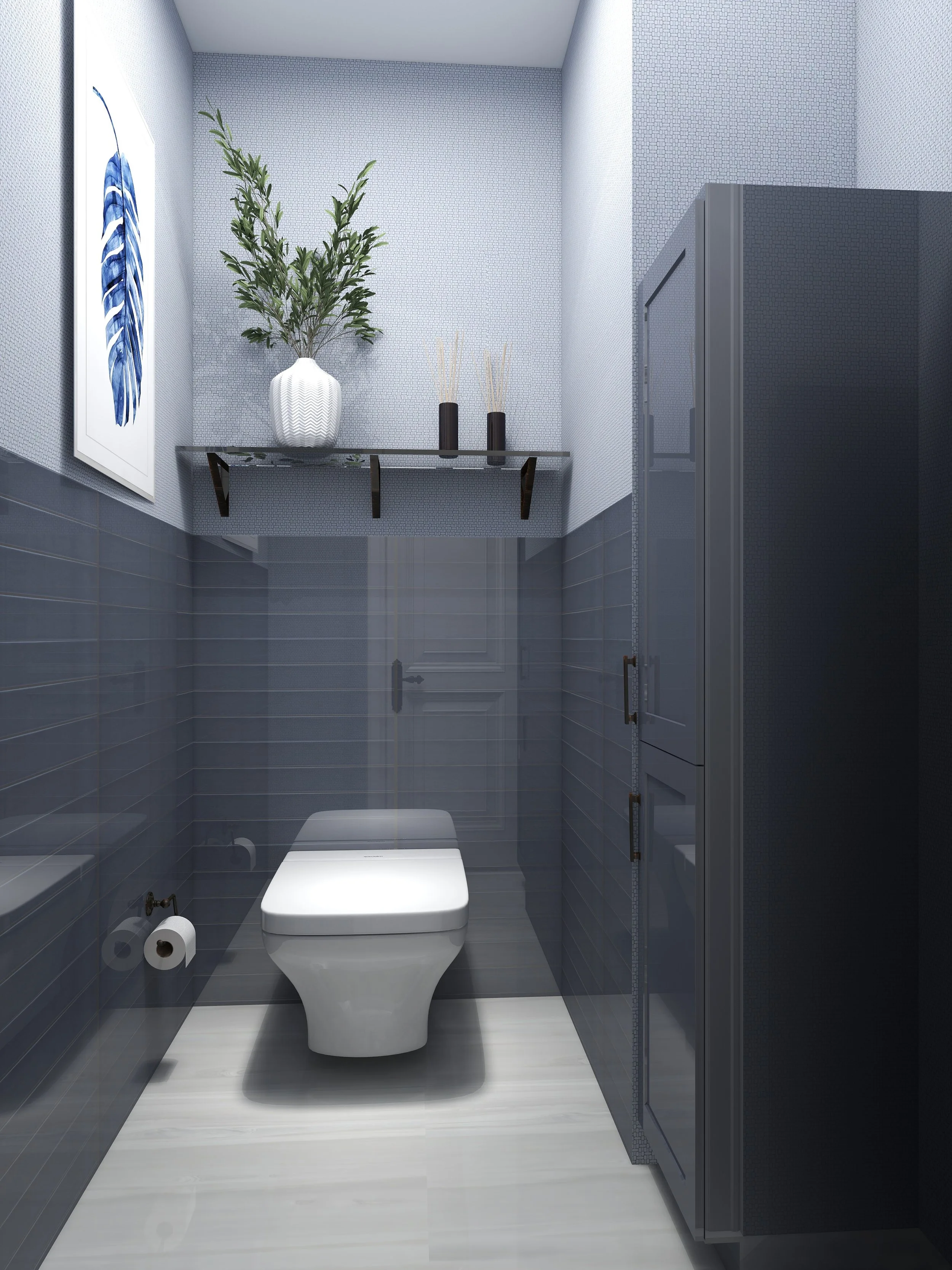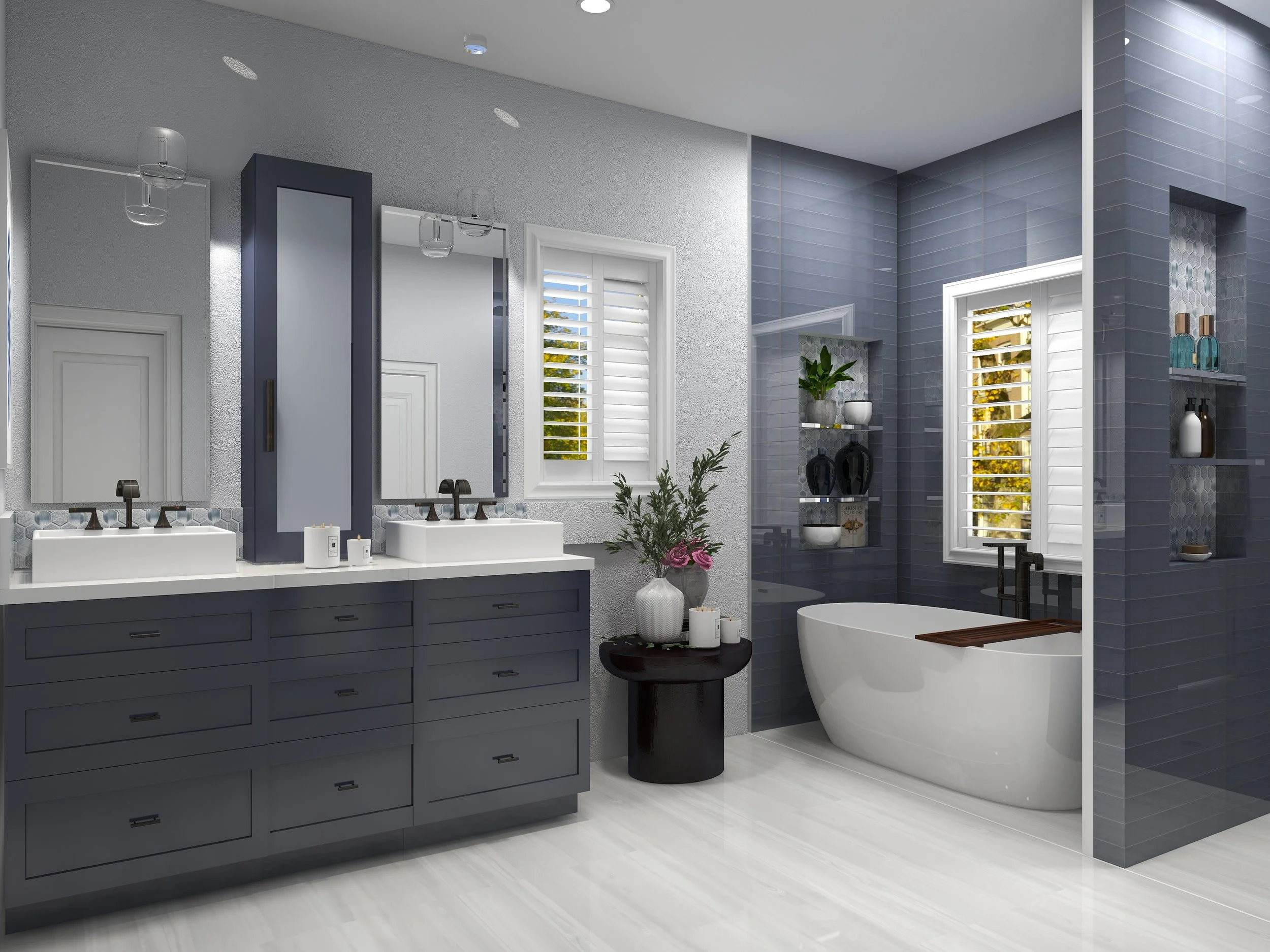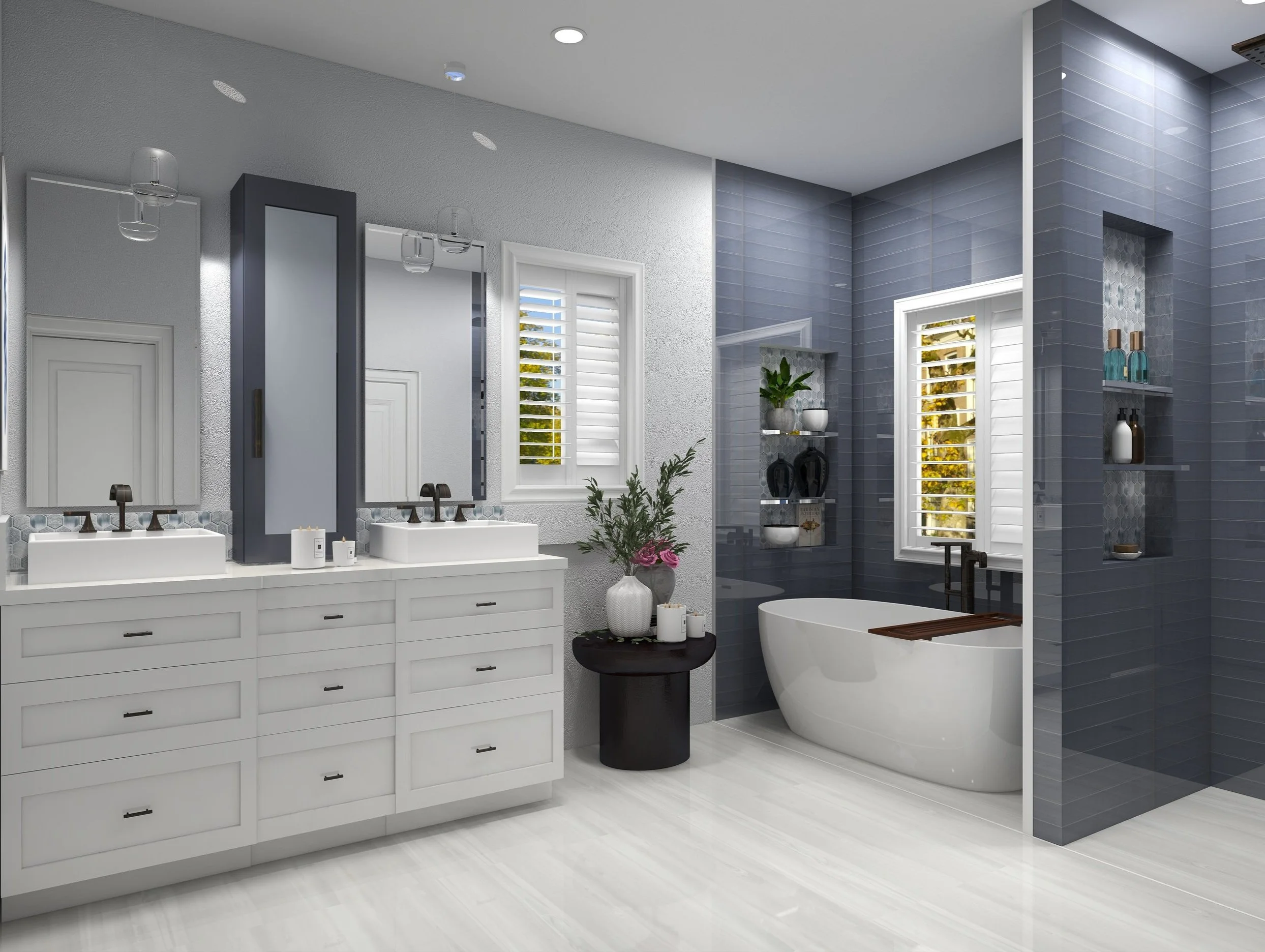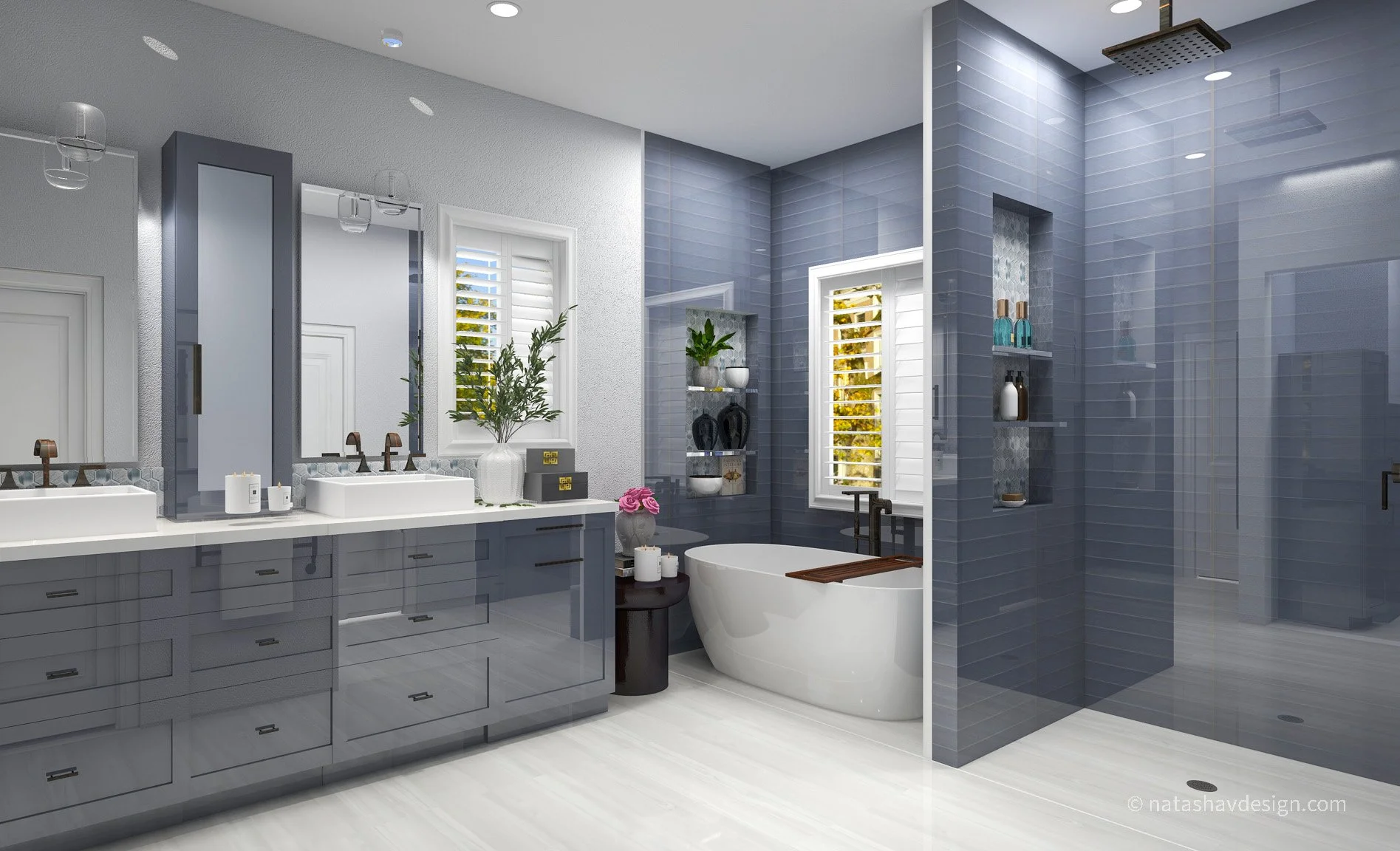 In the white vanity concept I designed a blue cabinet on top of the vanity. This brings in some of the blue tones from the tiles in the shower area.