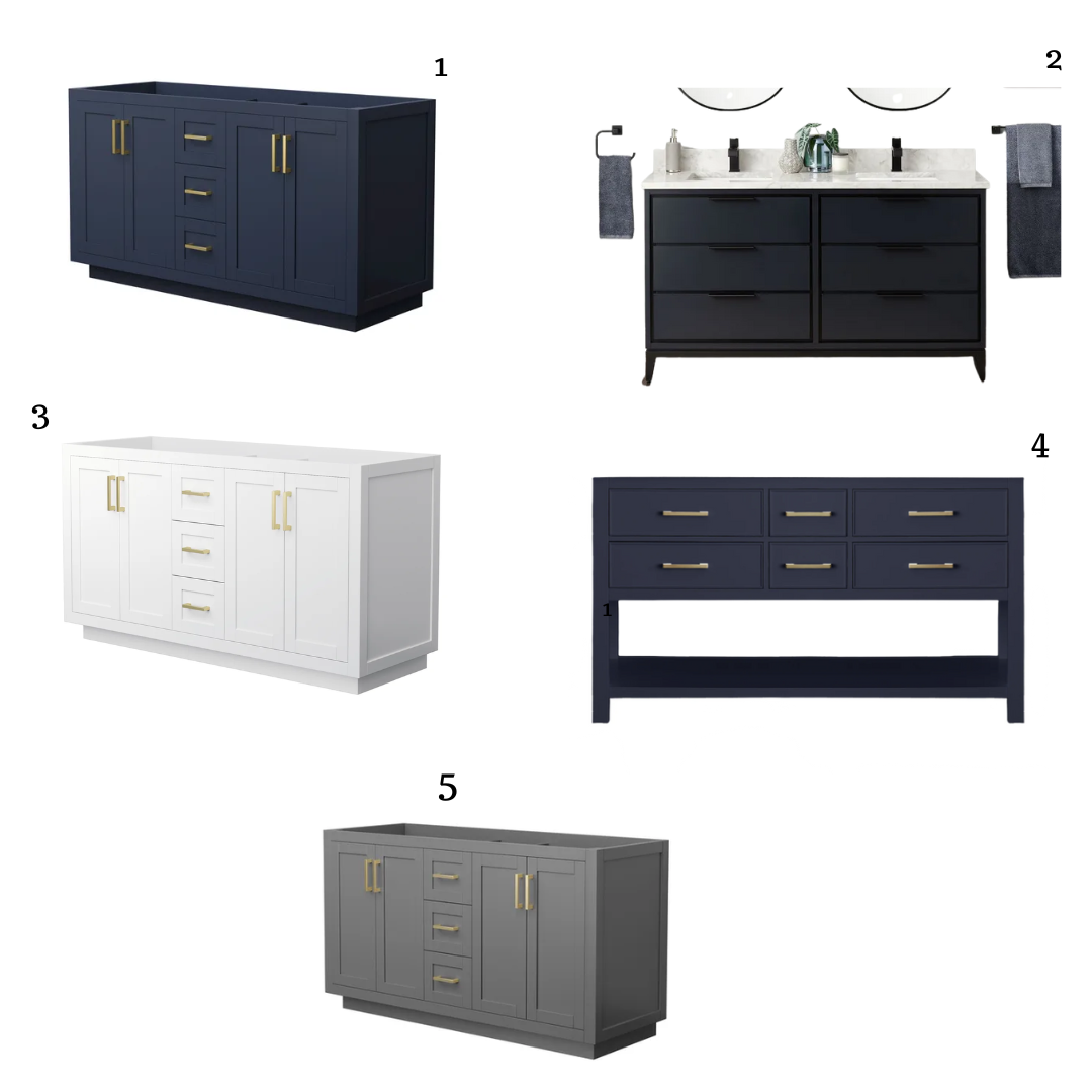 Below you will find 3 images with vanities in blue, grey and white. This will give you an idea of how the color may look in the your space. Below the 3 images you will find some vanity suggestions with links.