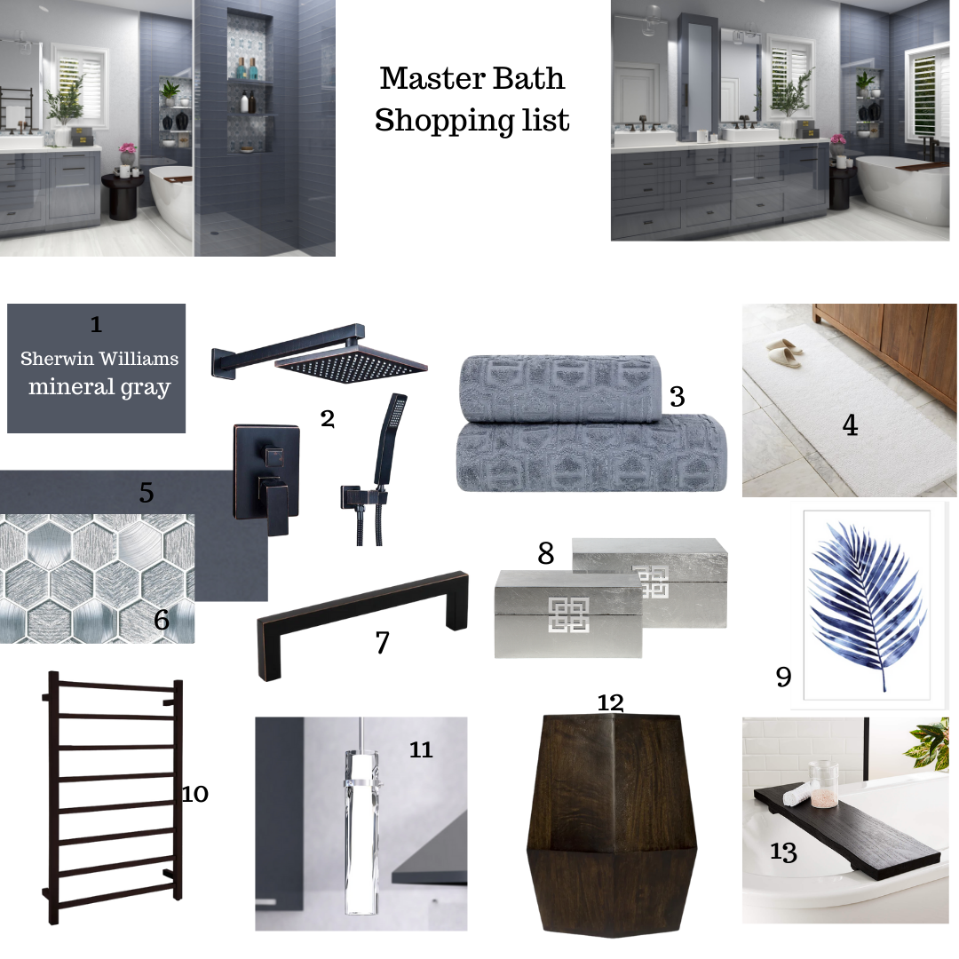 Vanity Cabinet- all drawers with laundry shoot attached- this would be a custom vanity. A recommended color sample is Sherwin Williams Mineral Gray.(This is a starting paint for color matching with tiles) I recommend ordering a color sample (conceptual design shows high gloss) on actual cabinetry piece along with tile samples. Pair them together in your bathroom space under natural light and artificial lighting) before purchasing actual items.